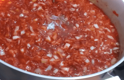 - Наливаємо 1 склянку подрібнених томатів (ми ще раніше подрібнили її у блендері). Чекаємо, коли овочева маса закипить.