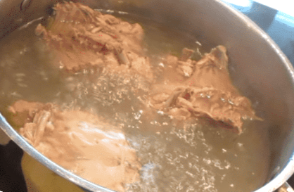 Спочатку готуємо бульйон. У холодну воду кладемо м'ясо, доводимо до кипіння. У процесі варіння утворюється пінка, її необхідно прибрати, інакше бульйон вийде каламутним. Після того, як м'ясо звариться, його прибирають із каструлі, а бульйон проціджують.